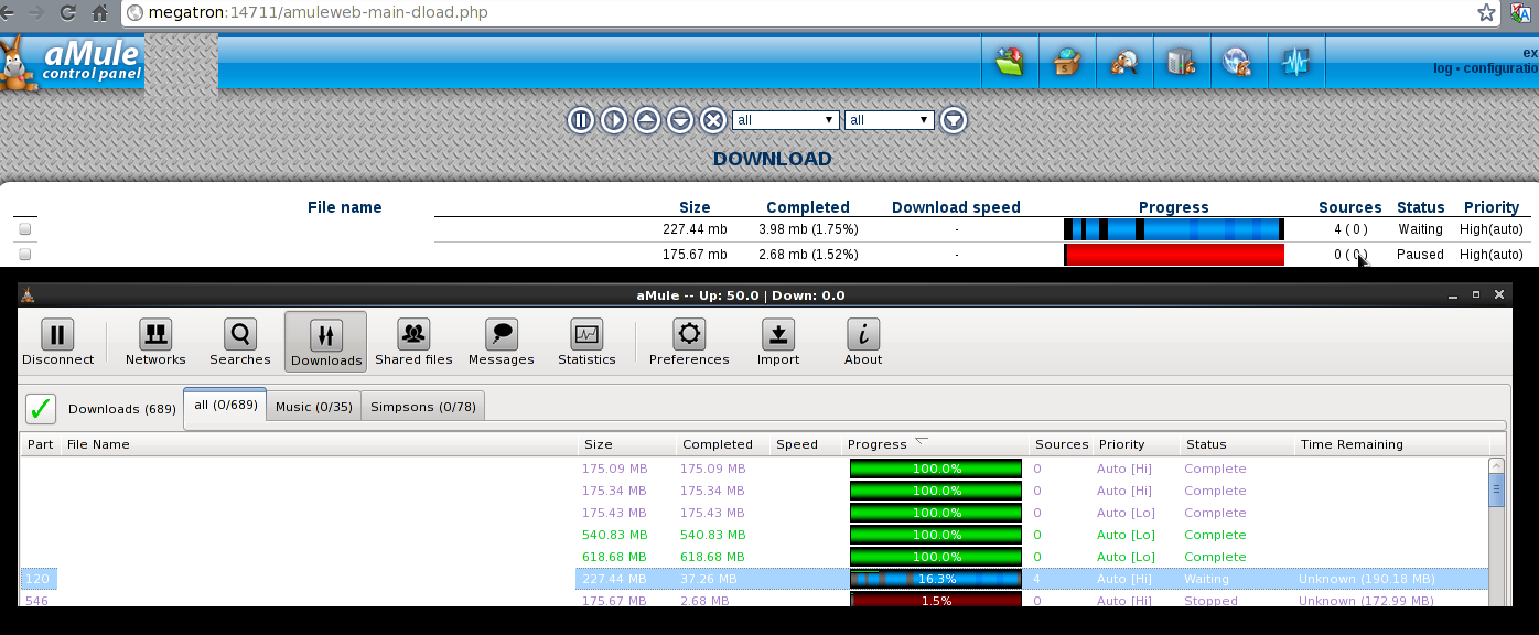 | Description | Hi! As you can see in the attached picture, the display in amuleweb is inconsistent with the real amount downloaded (aMule shows everything OK) for this file (the one highlighted in aMule and it's the first file in the amuleweb part). This is not a strange file, not very big, nothing particular about it. It has a comment on it however, in case it is important (files with comments are strange nowadays). Notice that the progress bar displayed in both amuleweb and amule is fine, the problem is only the percentage and downloaded amount displayed in amuleweb. Also notice that I tried using google chrome and firefox and both exhibit the same issue (the screenshot is chrome) | ||||||||||||