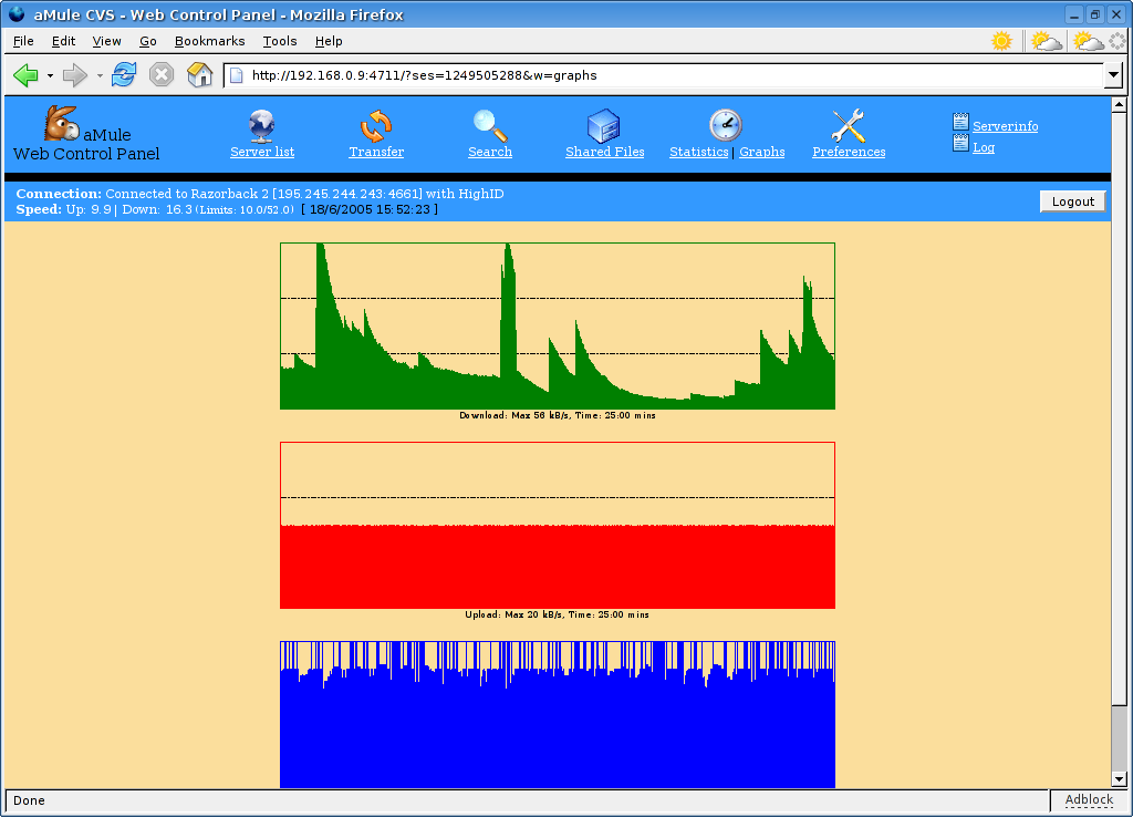 | Description | I don't know if this is a bug or it's normal, but sometimes aMuleGui and aMuleWeb get's a very high velocity of download, sometimes more than my real conection (I have 512k/b and i've seen aMule downloading at 67K/B :D). First a peak appears and then goes descending until arriving at the real velocity. I have included an image of the amuleweb's graph. Thanks KNagisa | ||||||||