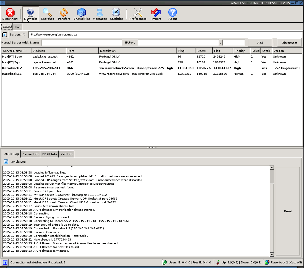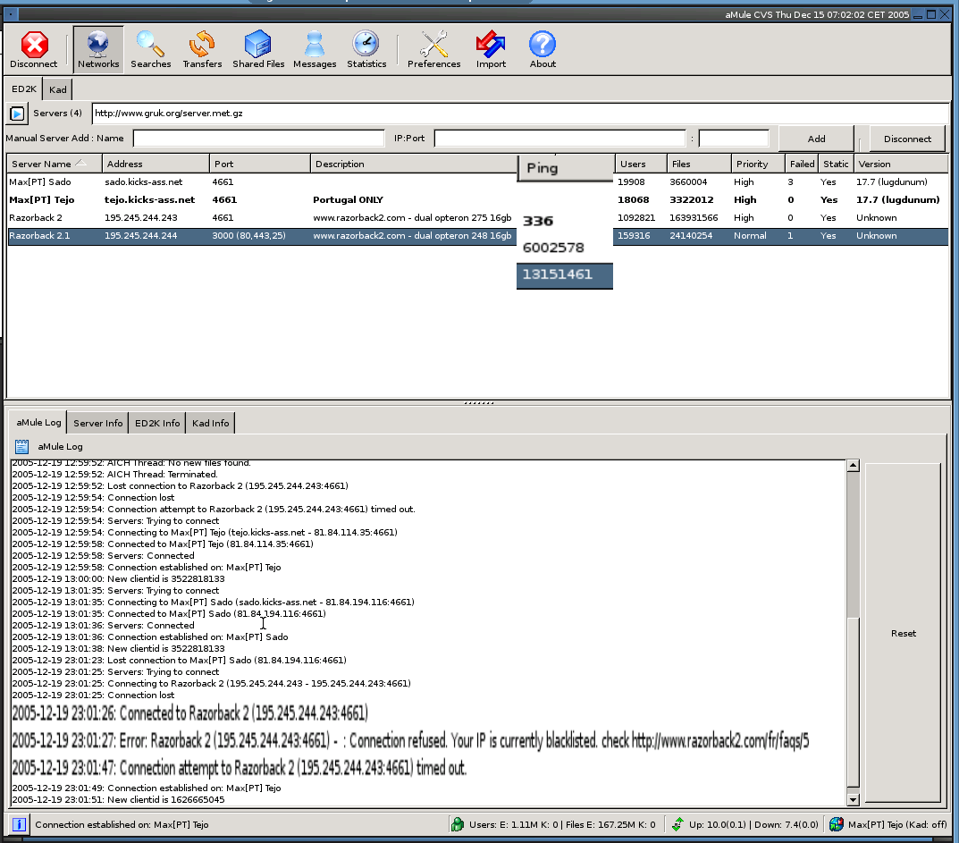 After talking to soundt3ch about this matter on IRC I saw that my pings on the server page are quite high for some servers, I'm talking about 5-7 figure numbers here. I'll recheck tomorrow to see if they are being updated. While the ping for Razorback2 (as an example) is a 7 figure number, I'm able to connect to it, High ID, Kad OK, and the regular console ping gives me an average round trip time of about 100ms. dude@server / $ amule --version aMule CVS using wxGTK1 v2.6.2 (Debugging) (Snapshot: rev. 6157) (OS: Linux) |