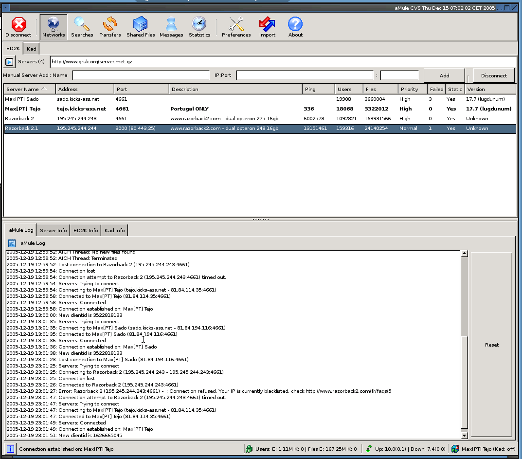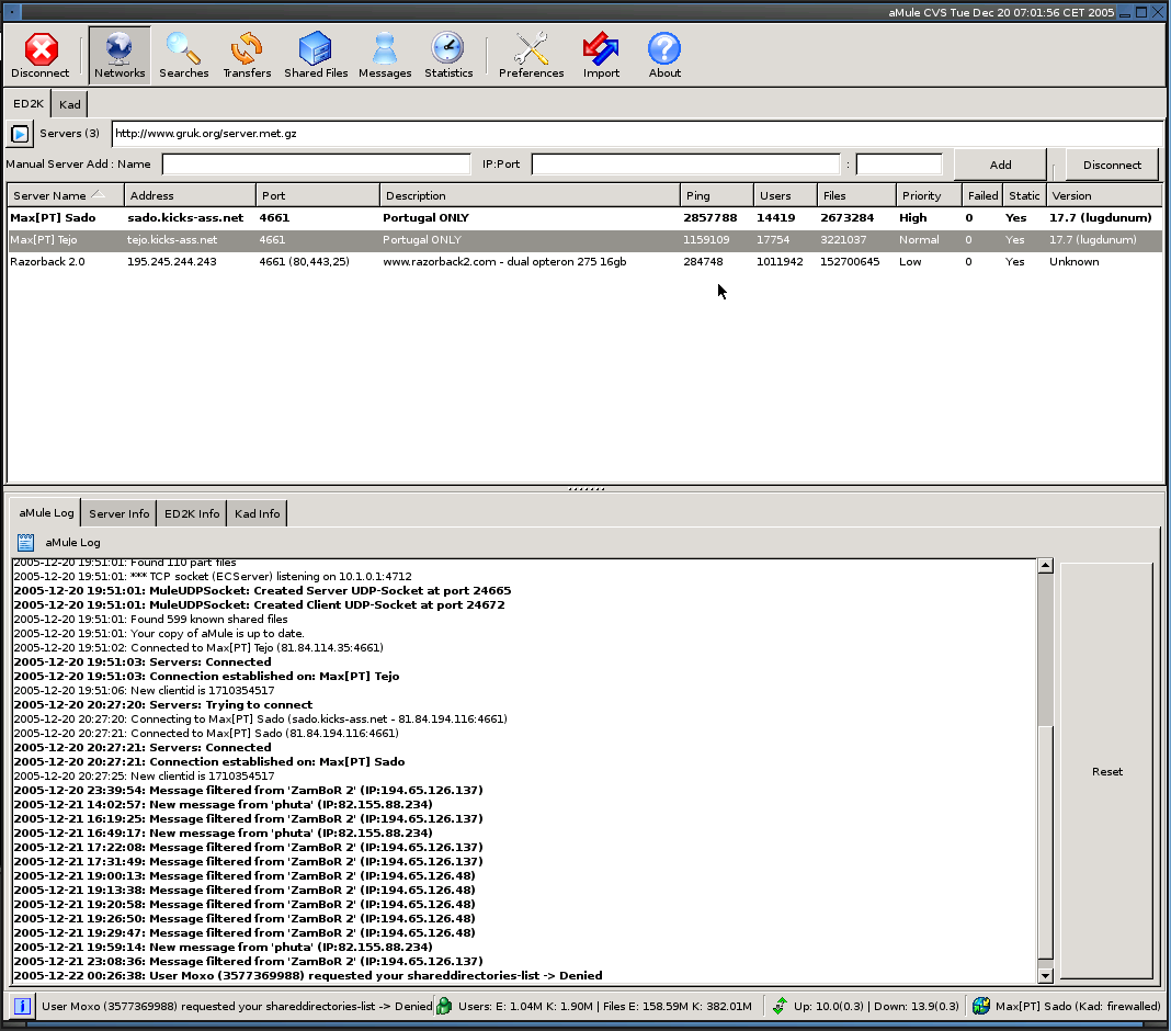 <Kry> you are sending packets. you are not receiving packets. There's no room for aMule bug there. <Kry> Remember the bug I found was causing too much UDP traffic. But it didn't matter for most people. for you, it resulted on a fucking lot of UDP packets dropped <Kry> Hence the high failure of server pings. <Kry> now that you send much less, you get much less failures. <Kry> You don't notice them on 2.0.3 because 2.0.3 has no Kad, hence almost insignifiant UDP traffic. |