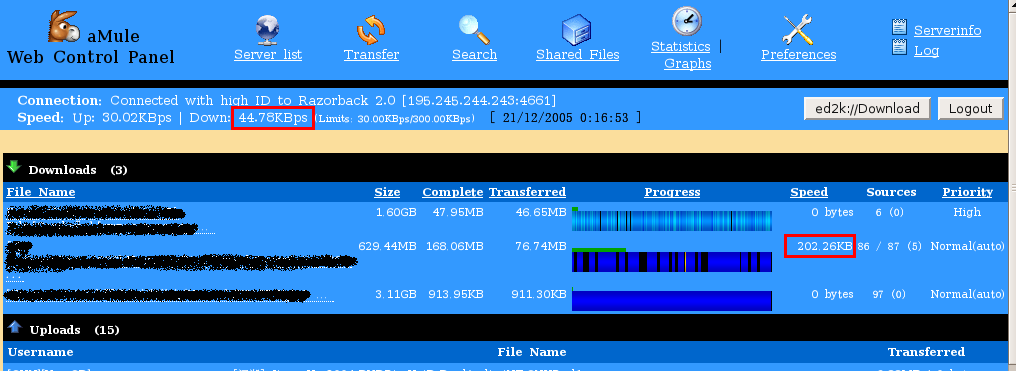 Currently mu amule is upgraded to the last stable version: 2.1.0. At this moment, in the estatus bar amule is downloading at a total speed of 6,9 KB/seg, but each file (is downloading two files) has a download speed > 6 KB/seg, (adding manualy the individual speeds of the files, the total is about 20-26 KB/seg). Seems that amulegui shows incorrect individual speed of files in downloads. The upload speeds are OK. |